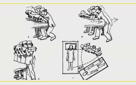 В этих случаях транспортировка нередко сочетается с оказанием неотложной помощи, для этого руки врача или фельдшера должны быть свободными. Носилки несут к машине, поддерживая максимально горизонтальное положение. По лестнице при этом больного спускают ногами вперед, поддерживая голову выше ног, а поднимают, соответственно, обратным способом — вперед головой.